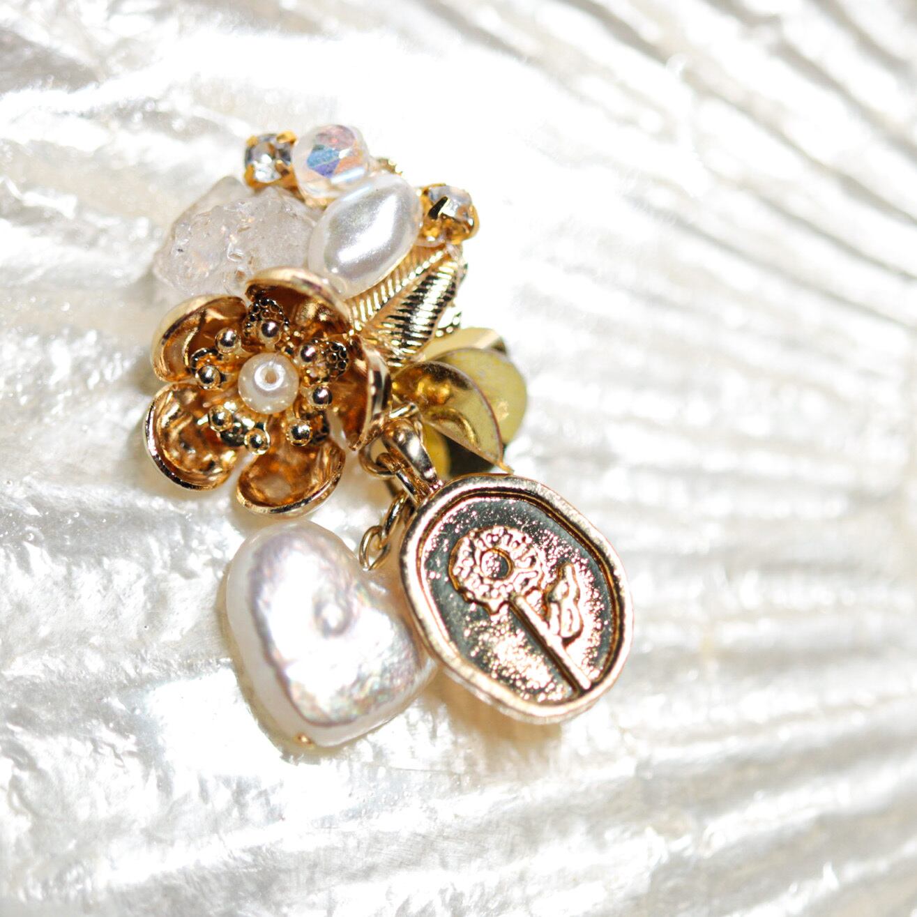 さまざまな形の淡水パール、メダイ、クリアビーズを組み合わせてラグジュアリーな印象のチャームで耳飾りを作りました。